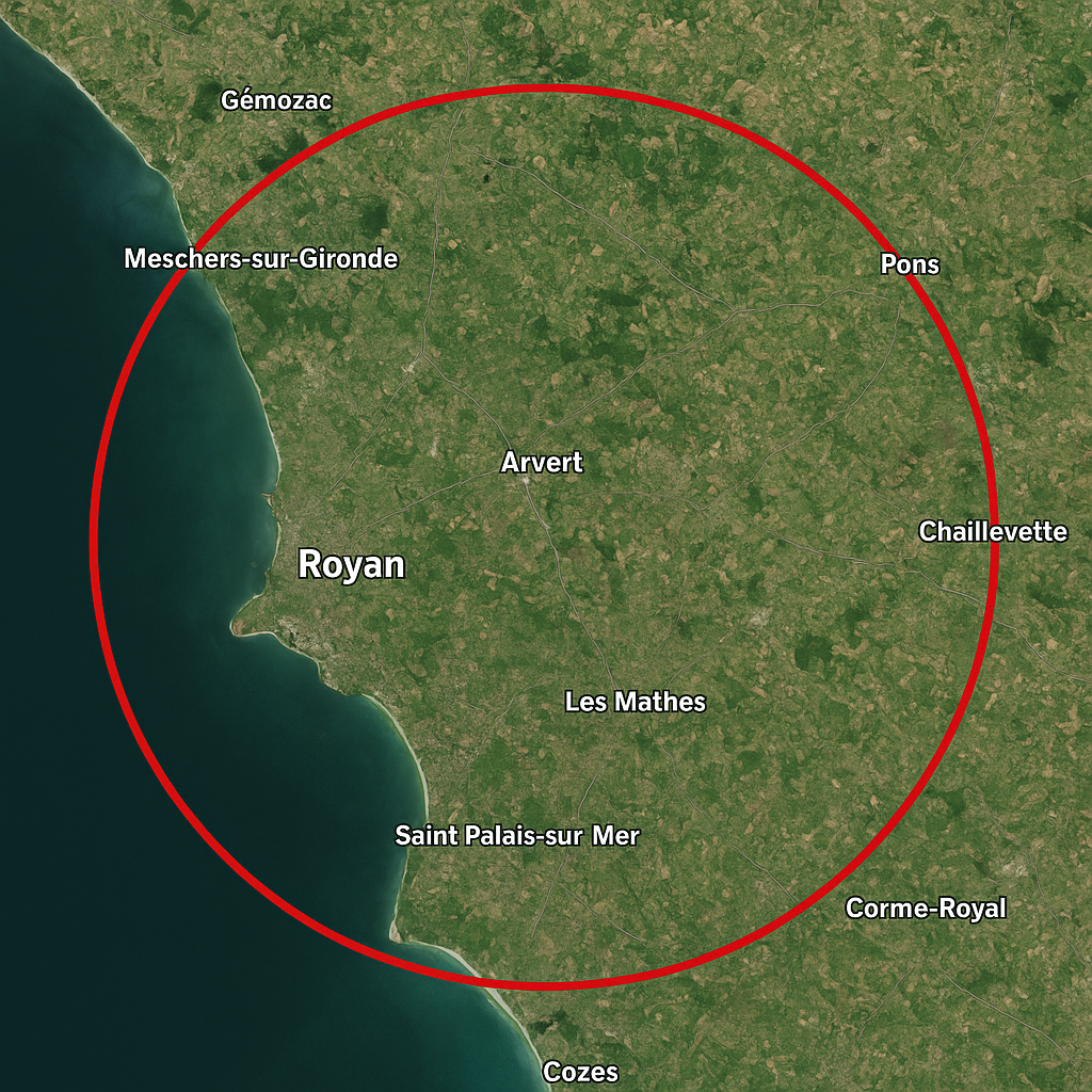 Vaux-sur-Mer, Saint-palais, Saint-Sulpice-de-Royan, Médis, Semussac, Saujon, Les Mathes, , Saujon, Saint Georges de Didonne, Meschers, le Gua, Cozes, Breuillet, Le Chay
